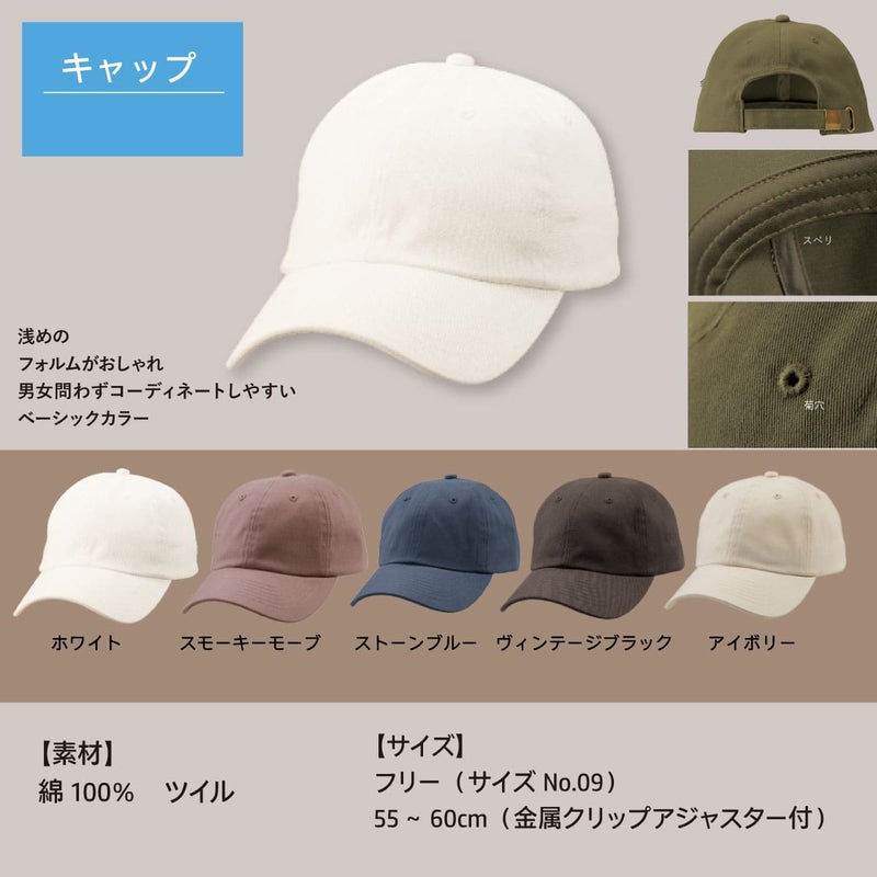 金属クリップアジャスター付きでサイズ調節ができ、ベーシックカラーを取り揃えているのでコーディネートに合わせやすく、男女問わず人気の定番キャップです。